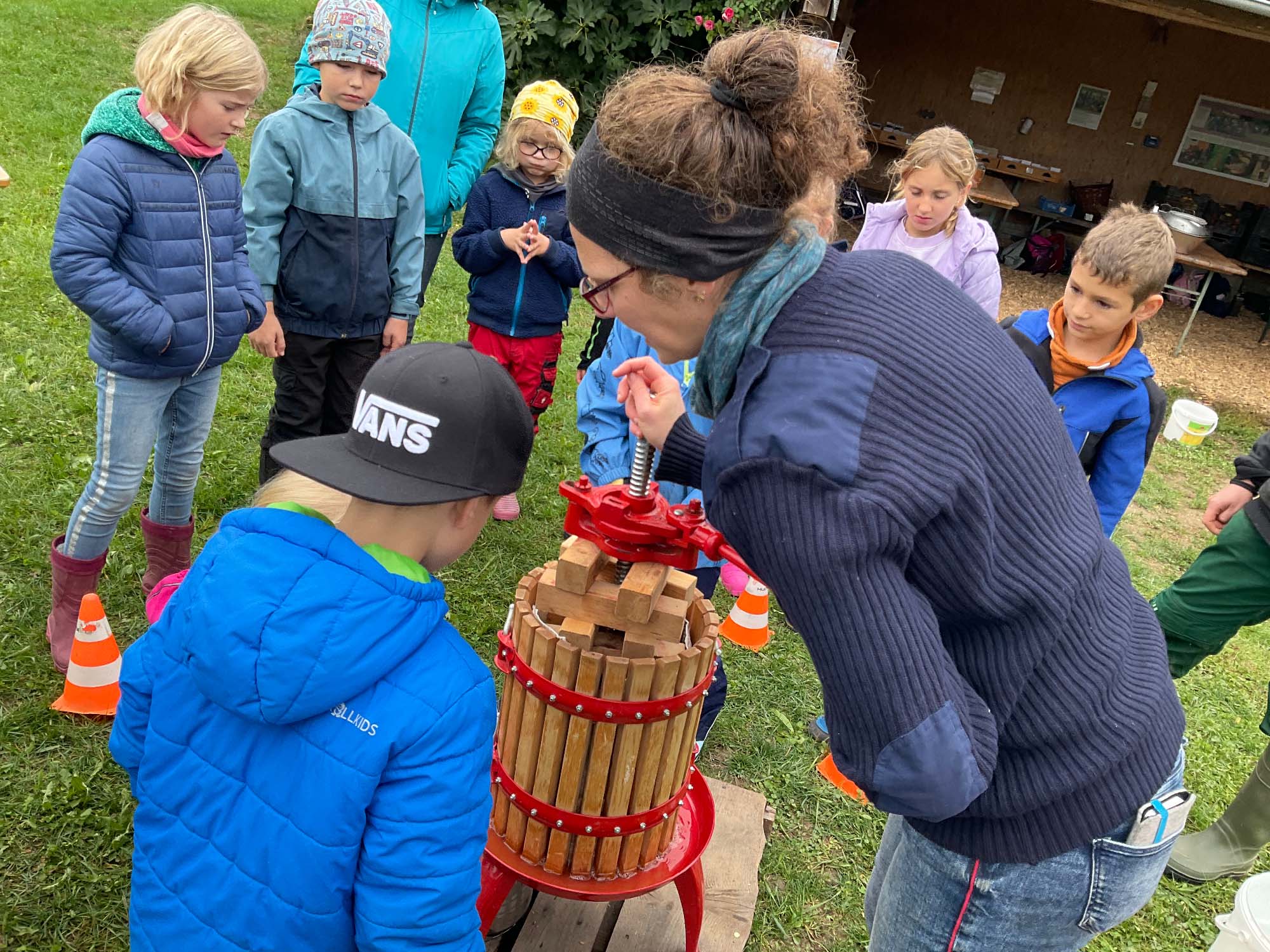 Anschließend ging es an die Apfelernte auf der benachbarten Streuobstwiese – schnell waren die Körbe mit leckeren Äpfeln gefüllt. Damit daraus dann der herrliche Apfelsaft gewonnen werden konnte, waren die Mädchen und Jungen mit Feuereifer bei der Sache, als es hieß: Äpfel reiben. In einer Obstpresse wurden dann die zerkleinerten Äpfel zu Apfelsaft gepresst. Natürlich wurde dann auch probiert, wie der Saft schmeckt. Lecker! – so lautete das Urteil der fleißigen Kinder, die Mühe hat sich gelohnt.